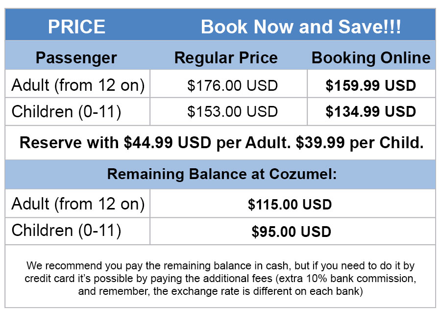Pick up locations: Puerto Juarez, Cancun Downtown, Cancun Hotel Zone, Puerto Morelos, Playa del Carmen Downtown, and Playa Car