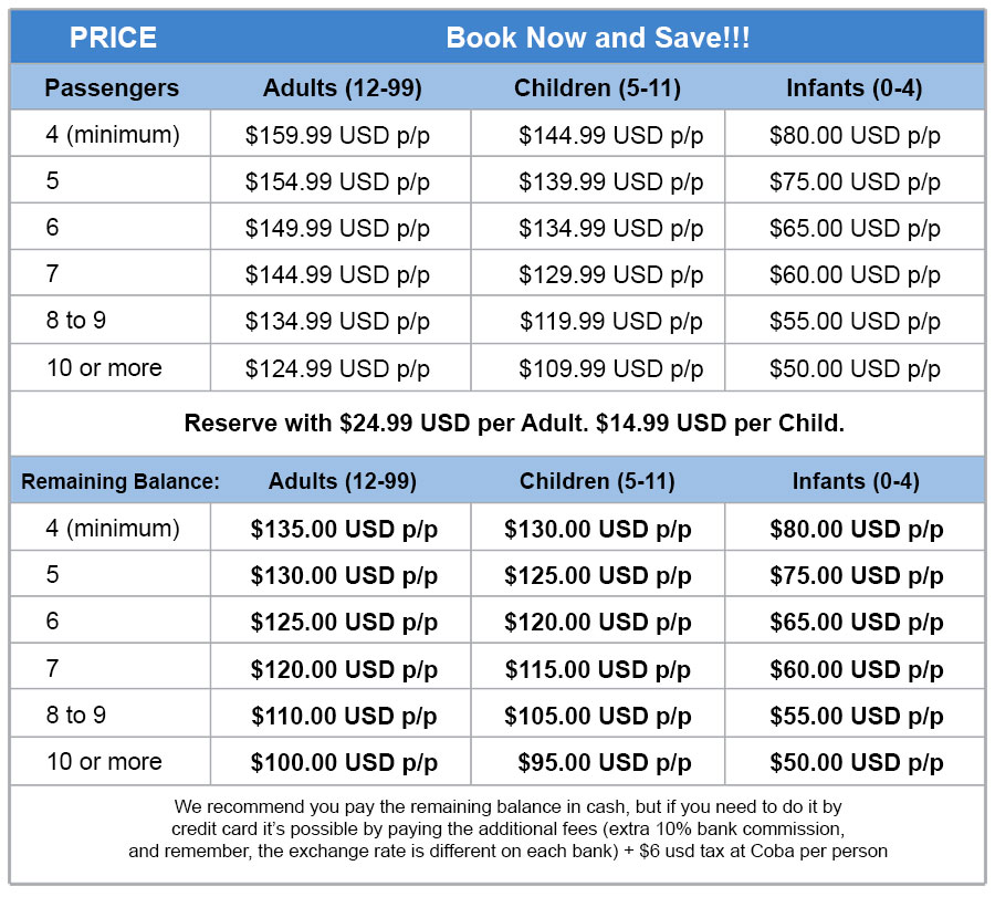 - Once you're finished visiting Coba, you’ll spend some time at a magical cenote where you can relax and cool down.