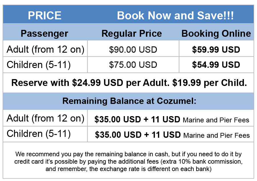 This is the perfect activity for visitors from mainland and people staying overnight at Cozumel. Because of its later start time, on your way back to the pier, you’ll enjoy Cozumel’s lively and warm sunset.