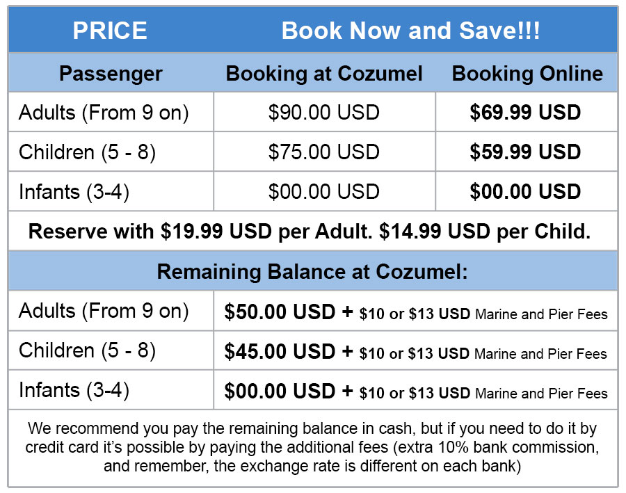- We will meet at the El Cid La Ceiba Hotel or the ferry pier (Depending on your selection for meeting point), where you will receive a quick introduction and the remaining balance will be collected. Your host will equip you with your new snorkel tube, courtesy of us at Safe Tours Cozumel.