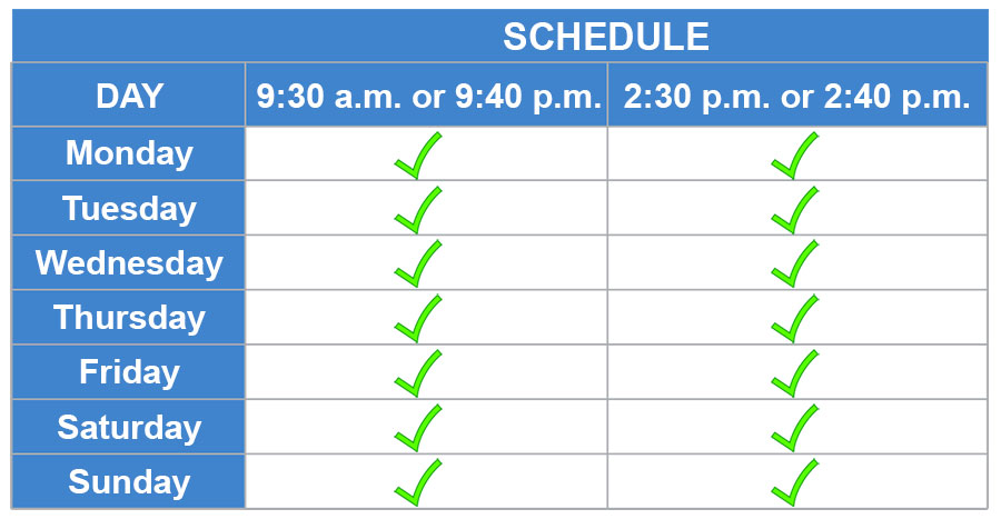 Starting time: 9:30 am or 9:40 am and 2:30 pm or 2:40 pm.