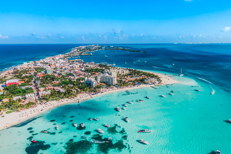 A 7 km de la costa, frente a Puerto Juárez, se encuentra Isla Mujeres. Con 7 km de largo y 1 km en su parte más ancha, forma en su Costa occidental la Bahía del Meco.