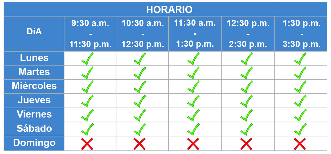 - Si usted no se presenta en el punto de reunión a la hora establecida, no habrá ni reprogramación, ni reembolso. Hay una ventana de 10 minutos, si no se presenta, se considerará una “NO SHOW”.