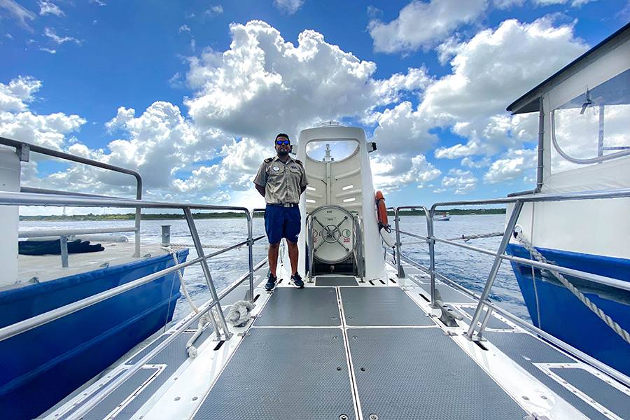 - Es hora de abordar el barco auxiliar y navegar por el arrecife Chankanaab antes de llegar al submarino.
